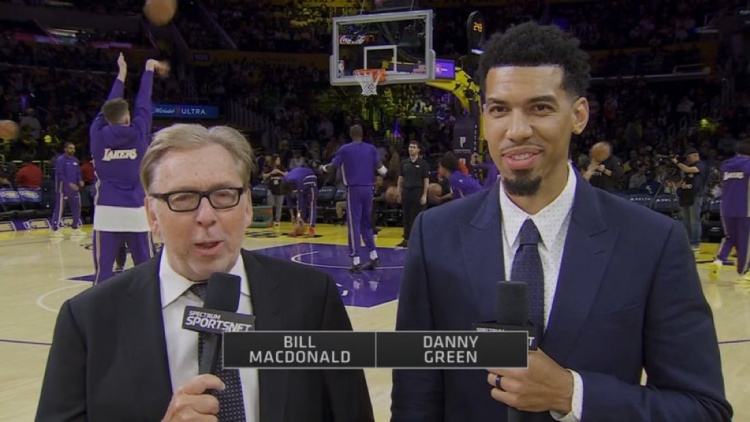 10月13日讯 今日前NBA球员、现湖人电台Spectrum SportsNet解说员丹尼-格林现场解说湖人VS勇士的季前赛。