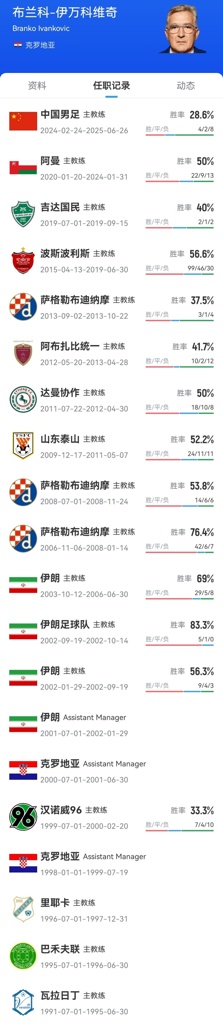 2024年2月24日,伊万出任中国男足主帅,2025年6月27日下课,期间共带队正式比赛14场,战绩为4胜2平8负。其中世预赛36强赛国足1胜2平1负“躺进”18强赛,18强赛国足3胜7负进7球丢20球,提前1轮无缘2026美加墨世界杯。国足也成为伊万执教生涯的最后一站。